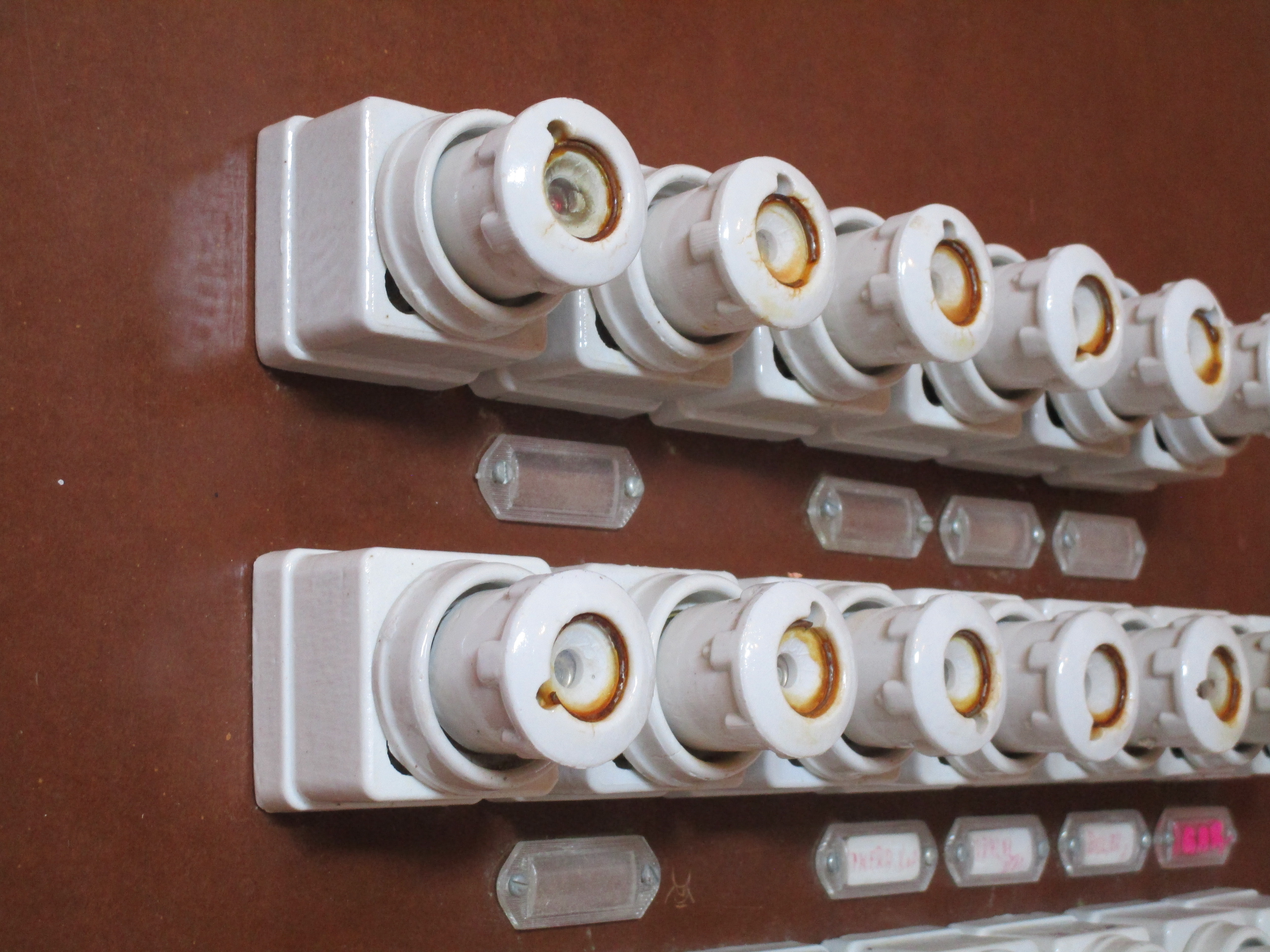 Each circuit has a small plastic label holder below it, inside which a small piece of paper can be inserted to indicate its function, though many of the labels are missing. While most of the circuits are single phase, there are also two three-phase ones which thus have three fuses per circuit, with a single label underneath.