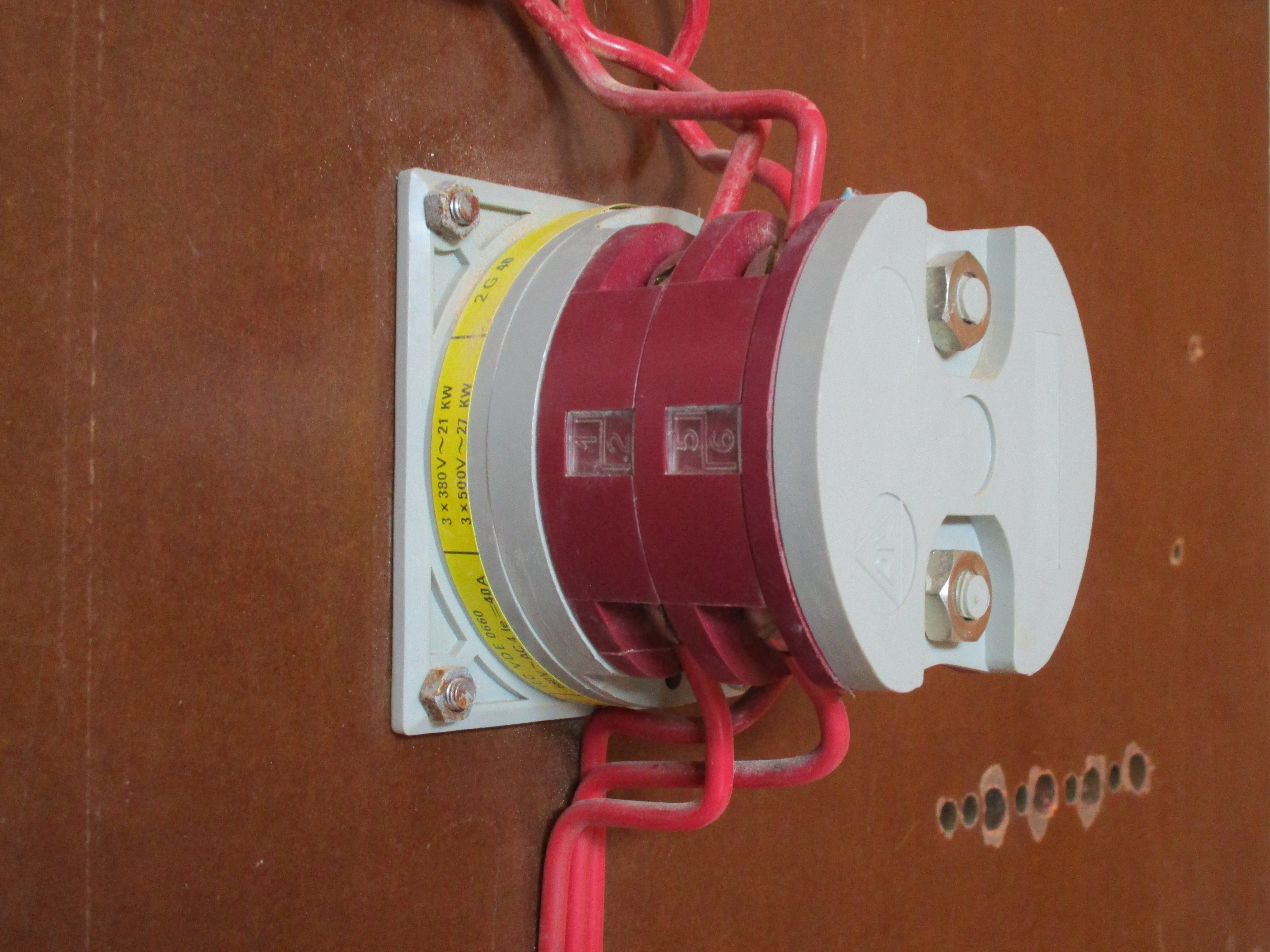 The input side of the main switch is connected to similar red wires, though without the careful wiring arrangement. At the end of these wires there are three white "choc-block" terminals, presumably a modification from an earlier relocation of the power meter. The main fuses or breakers for protection of the incoming supply were once housed in a separate cabinet inside the house, also sealed, and later moved elsewhere.