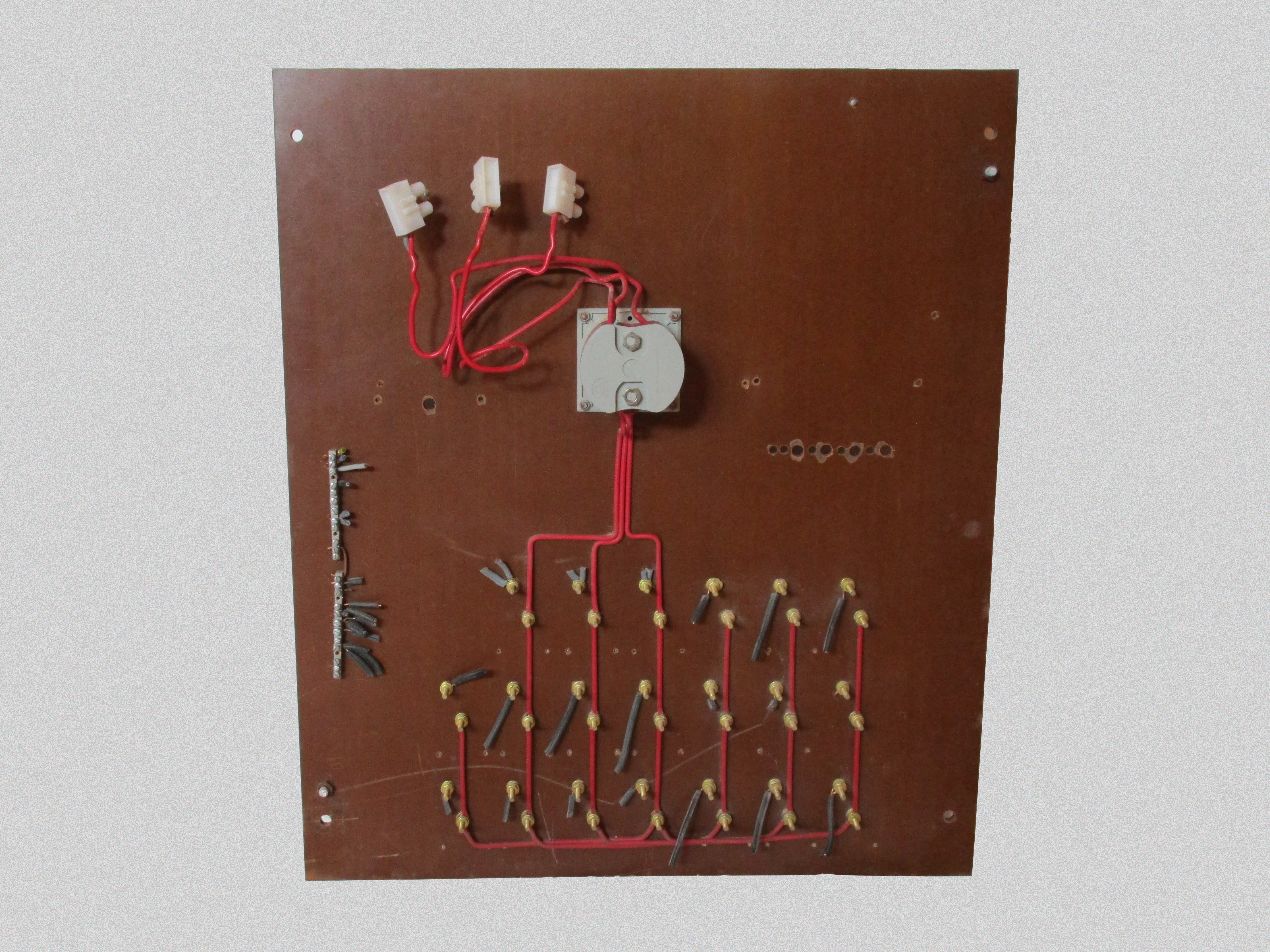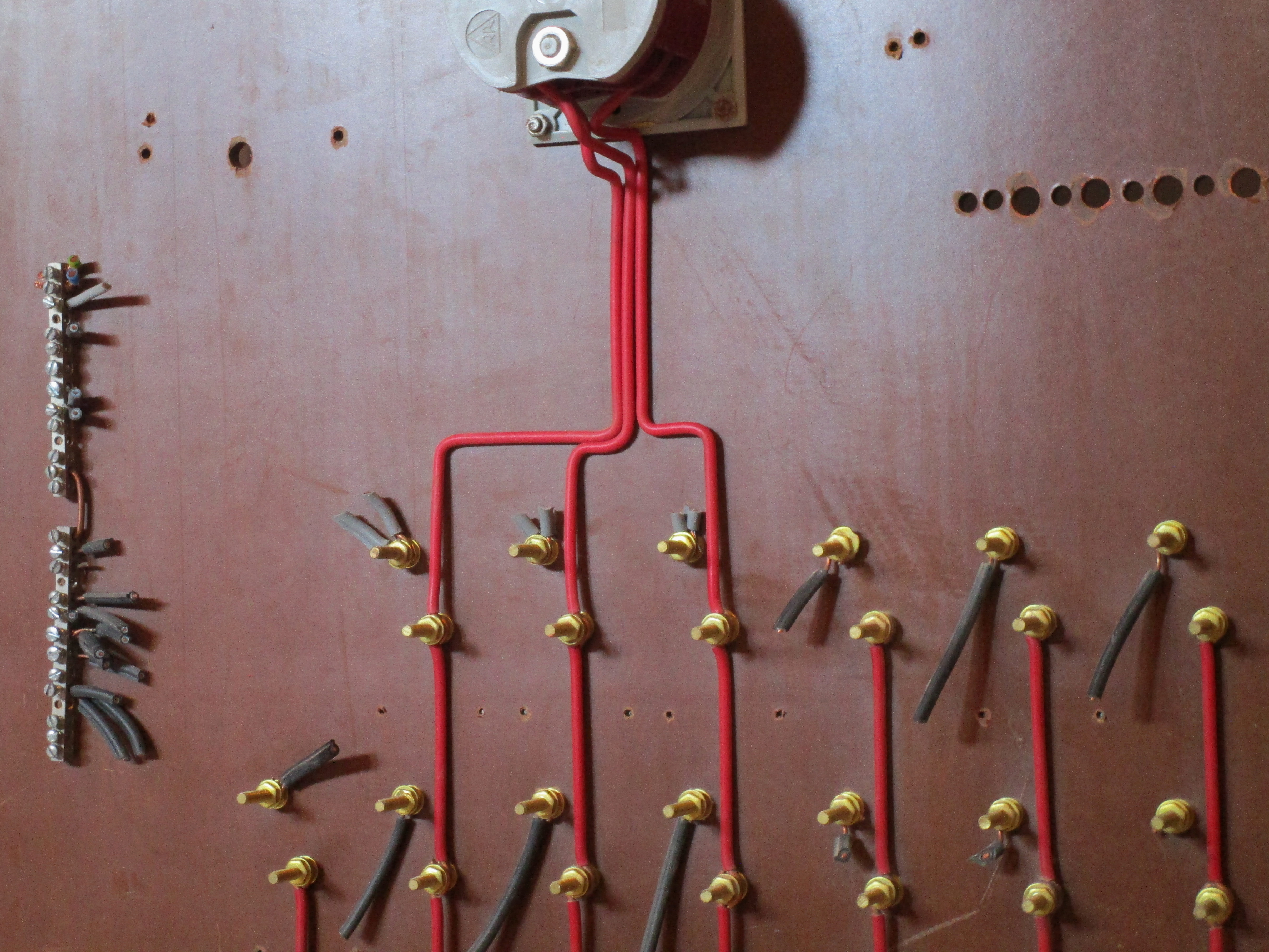 The rear of the fuse box features an intricate and clearly well-thought out layout using pieces of solid-core wire carefully measured, cut and bent to connect all the various individual fuse holders to the main switch. Each fuse holder is held with two long screws, which double as crude wire terminals. The red distribution wires, one per phase, run between them and are held with a nut and washer.