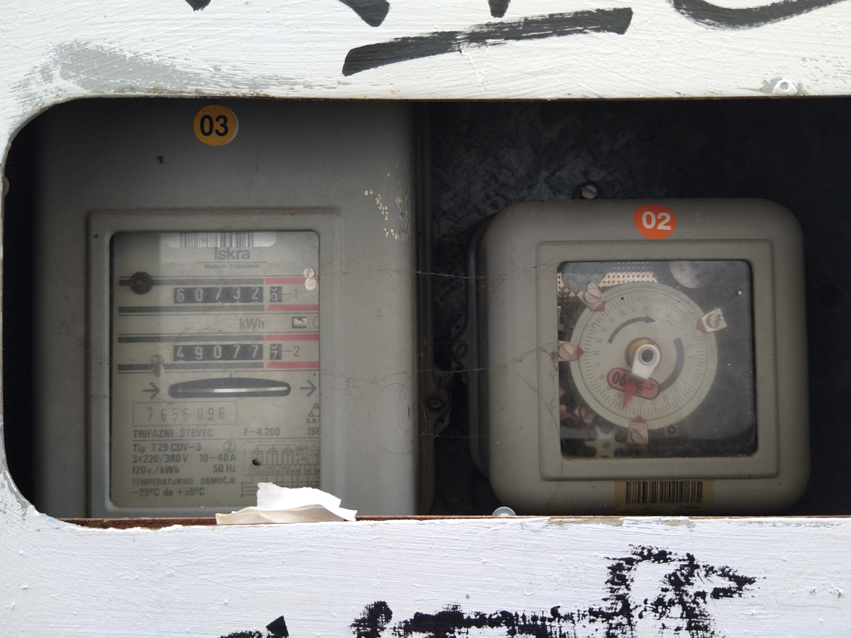 Both the power meter and the second device to the right are no longer present, so we can't know for sure what the latter would've been. However, it's likely that it would've been a time switch, a special clock for controlling time-based variable power rates, indicated by a second register on the power meter that could be switched to by powering an additional terminal - a hole for which can still be seen on the board. The third photo below shows such a setup outside of a building in Koper, Slovenia, with a three-phase Iskra meter with dual registers and a matching time switch.
