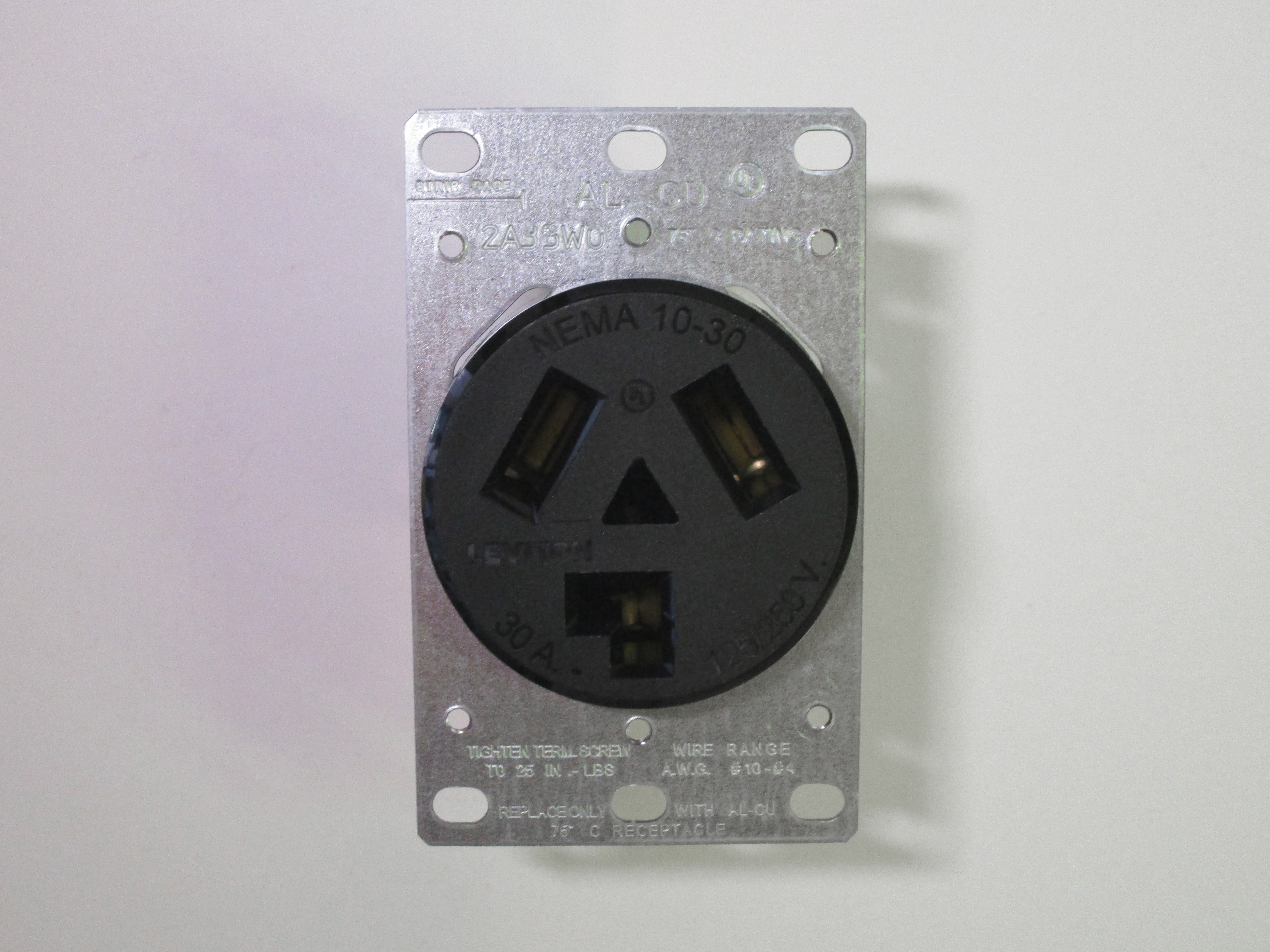 NEMA 10 connectors are a nowadays-deprecated series with two line terminals, providing 240V, and a neutral, but no separate earth connection; they are thus often referred to as "three-wire" plugs. The NEMA 10-50R and 10-30R types shown here were particularly common for electric stoves and clothes dryers, and have nowadays been replaced with the 14-50R and 14-30R shown previously.