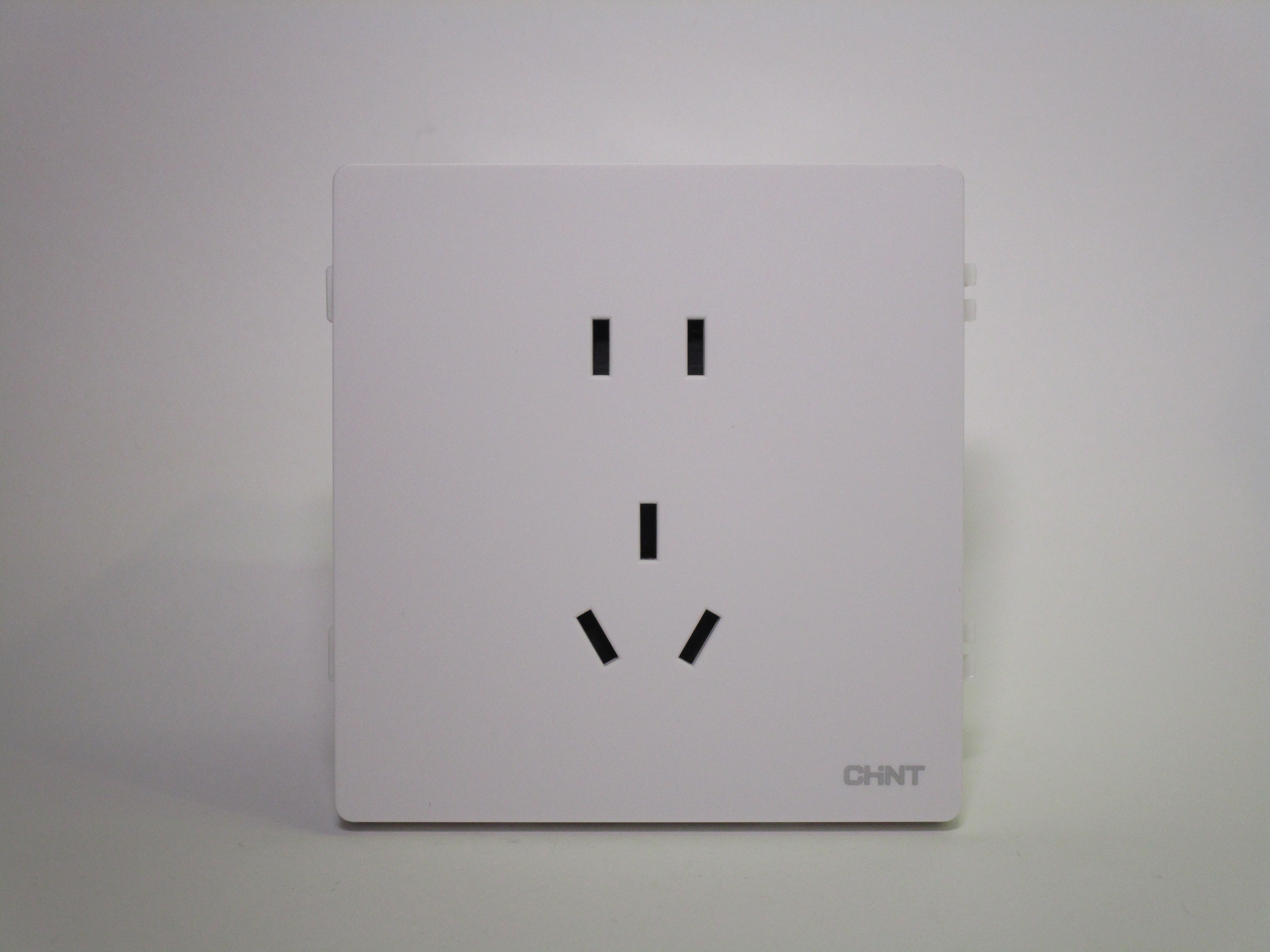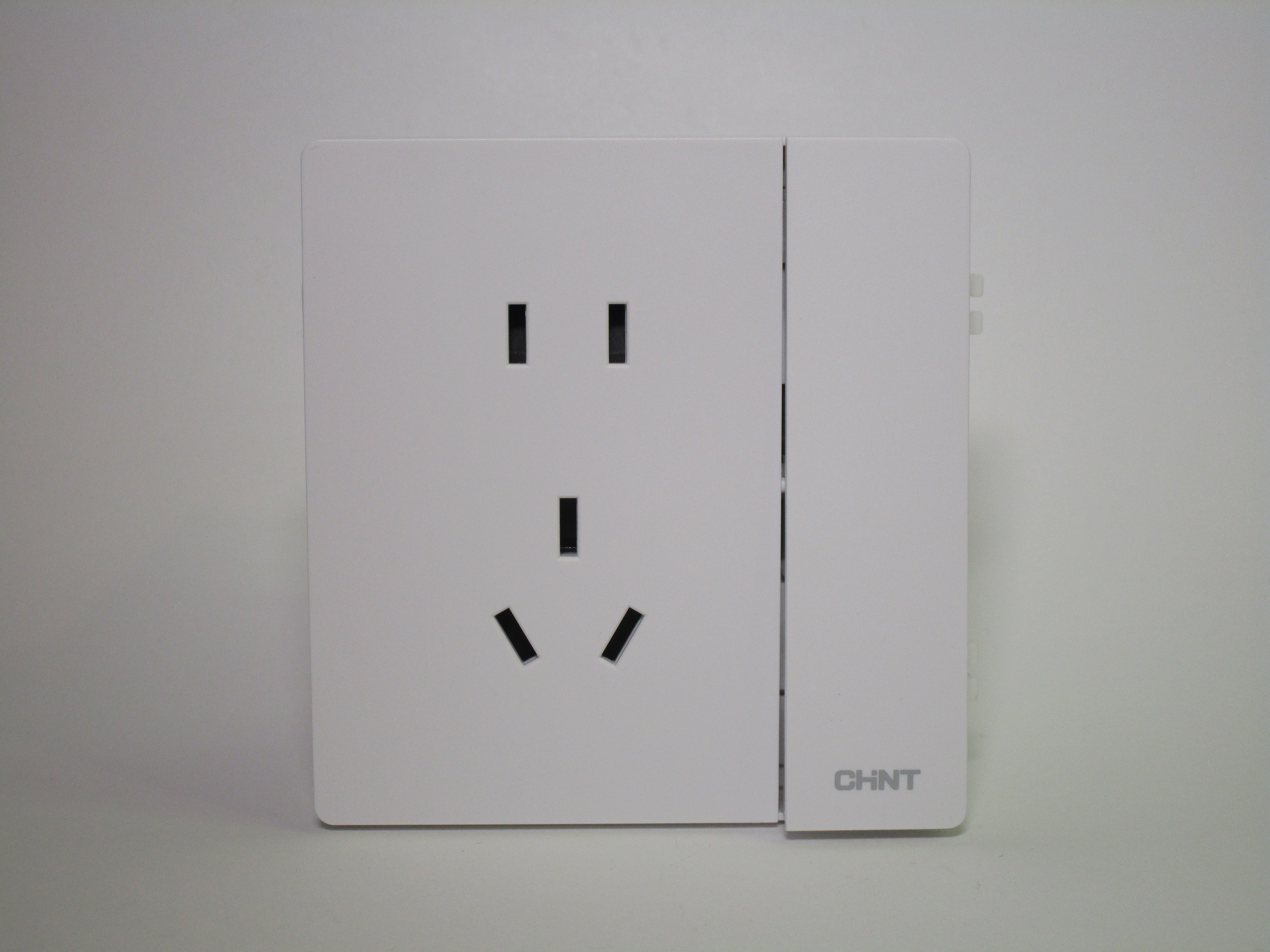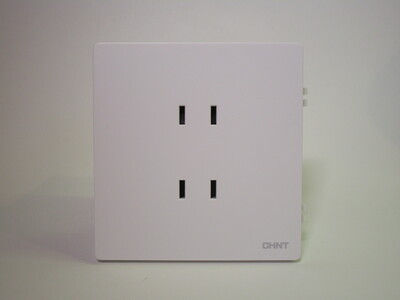 As mentioned, Chinese power sockets typically feature both Australasian and American 2-prong outlets. Such is the case on this example from Chint, a popular manufacturer of electrical items in China. It has a modern design and appearance and an overall high-quality feeling. Both parts of the socket feature shutters.
