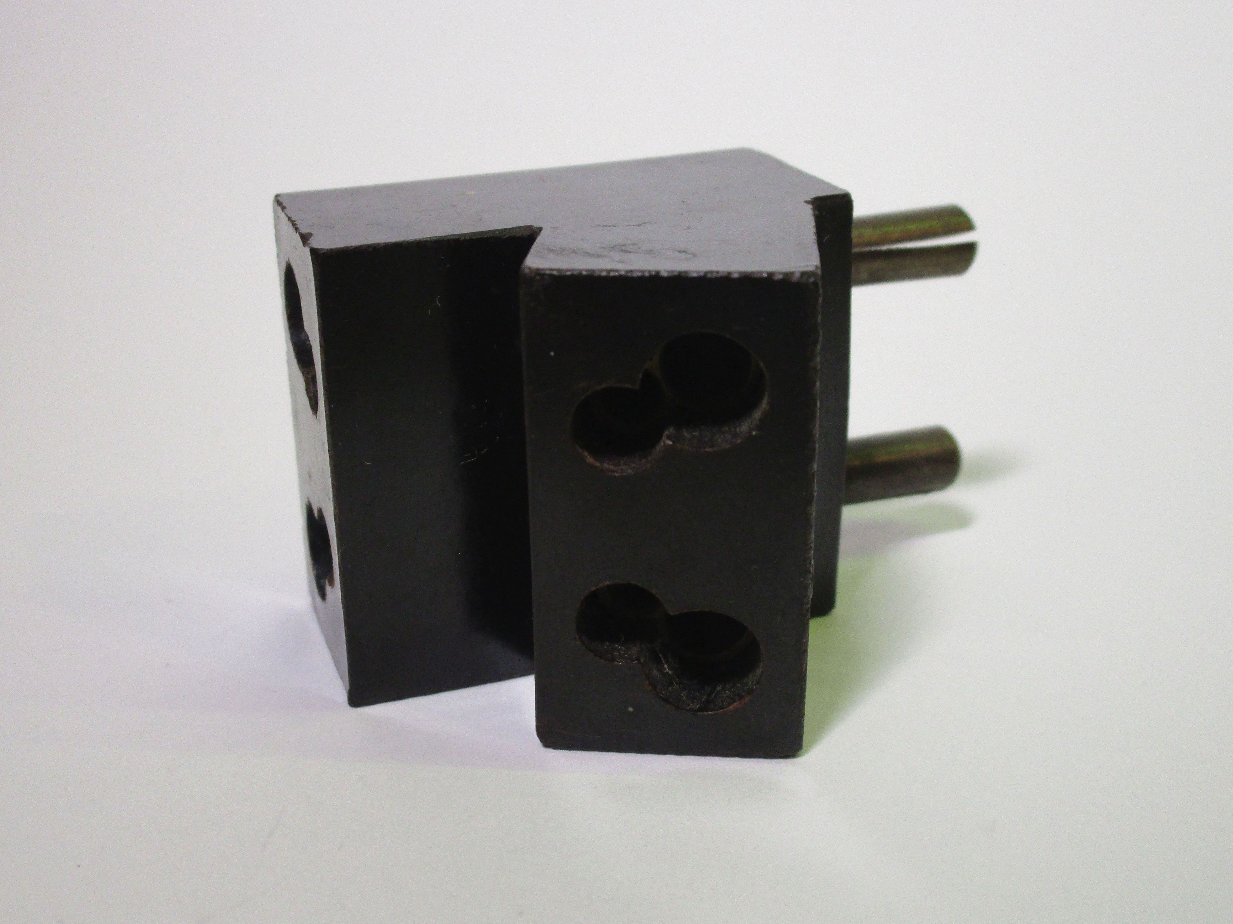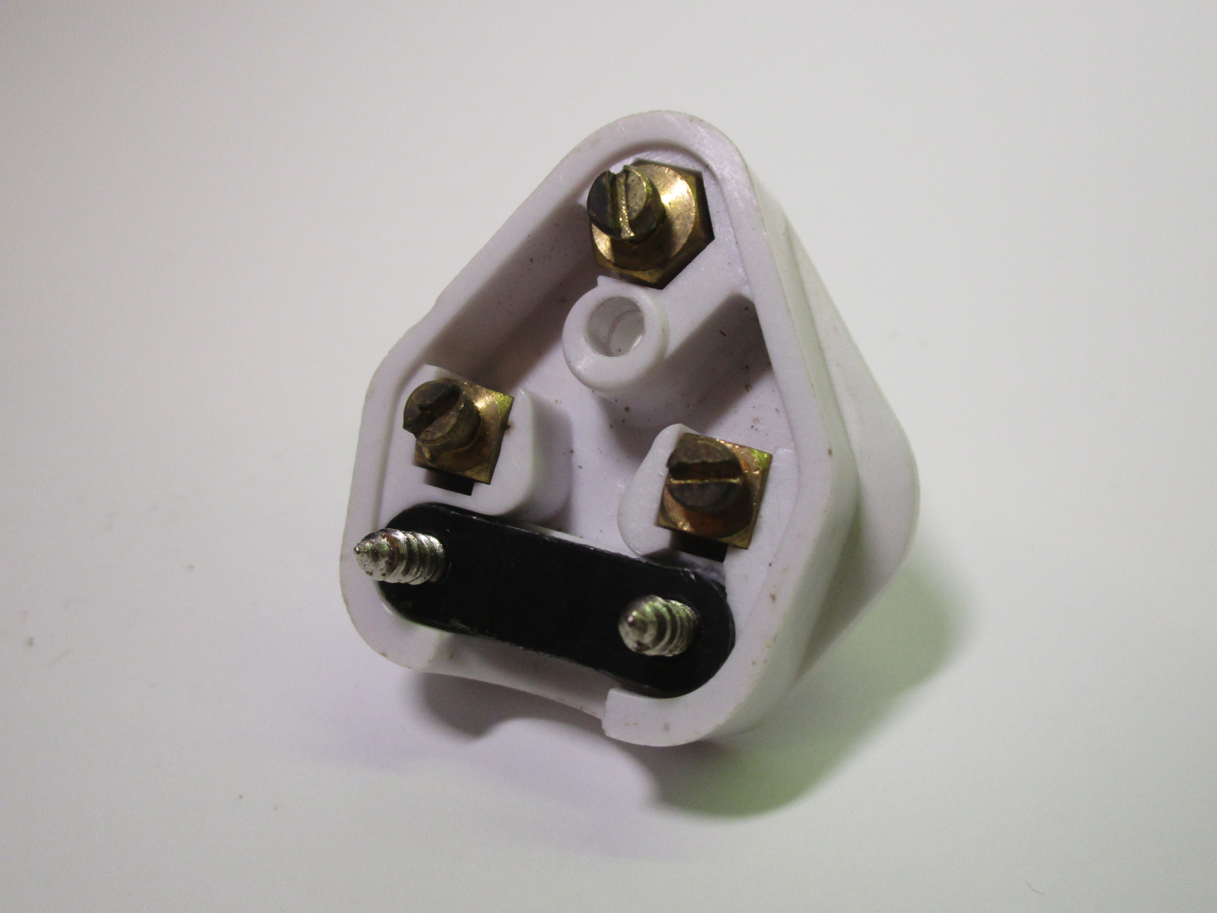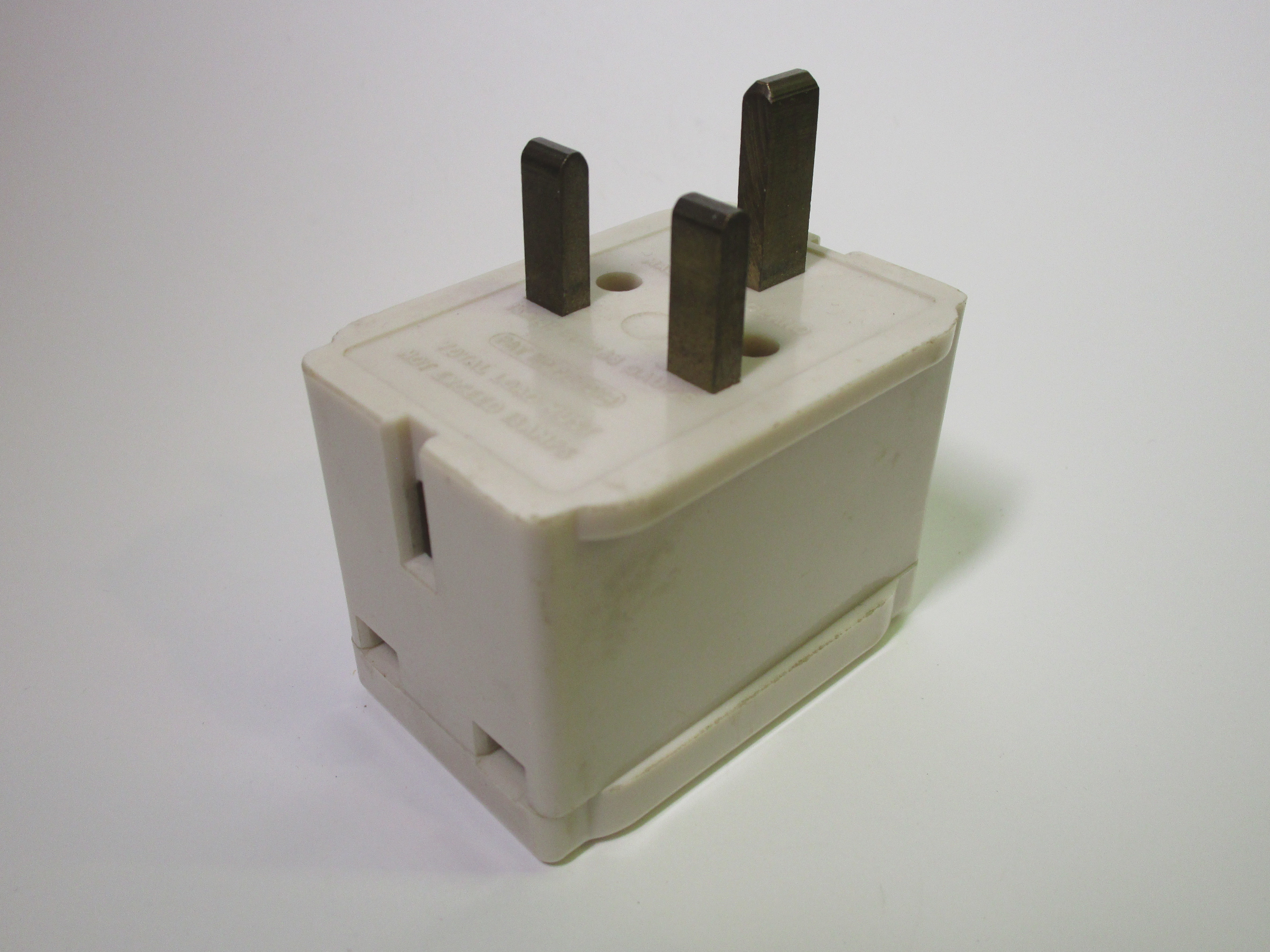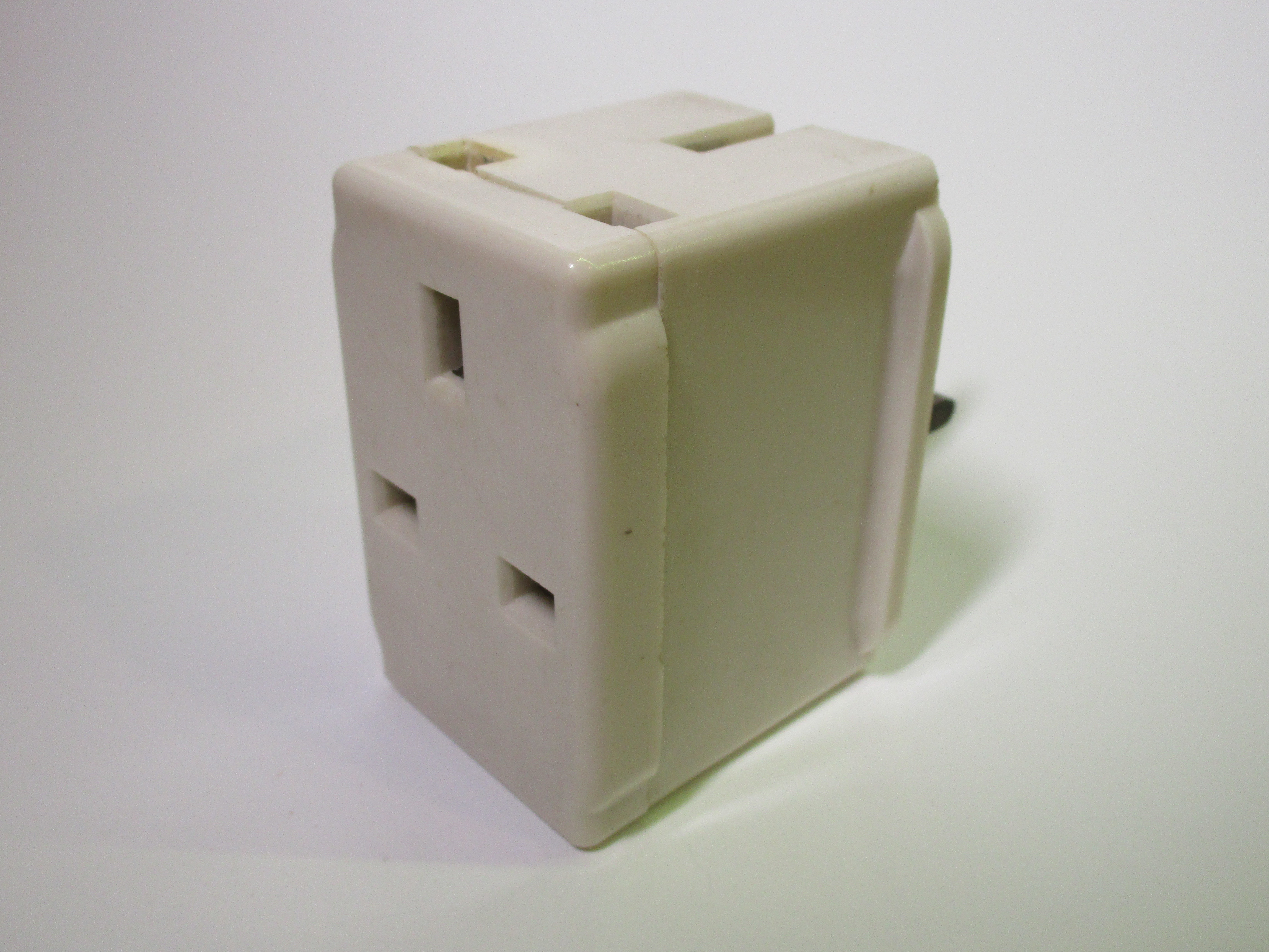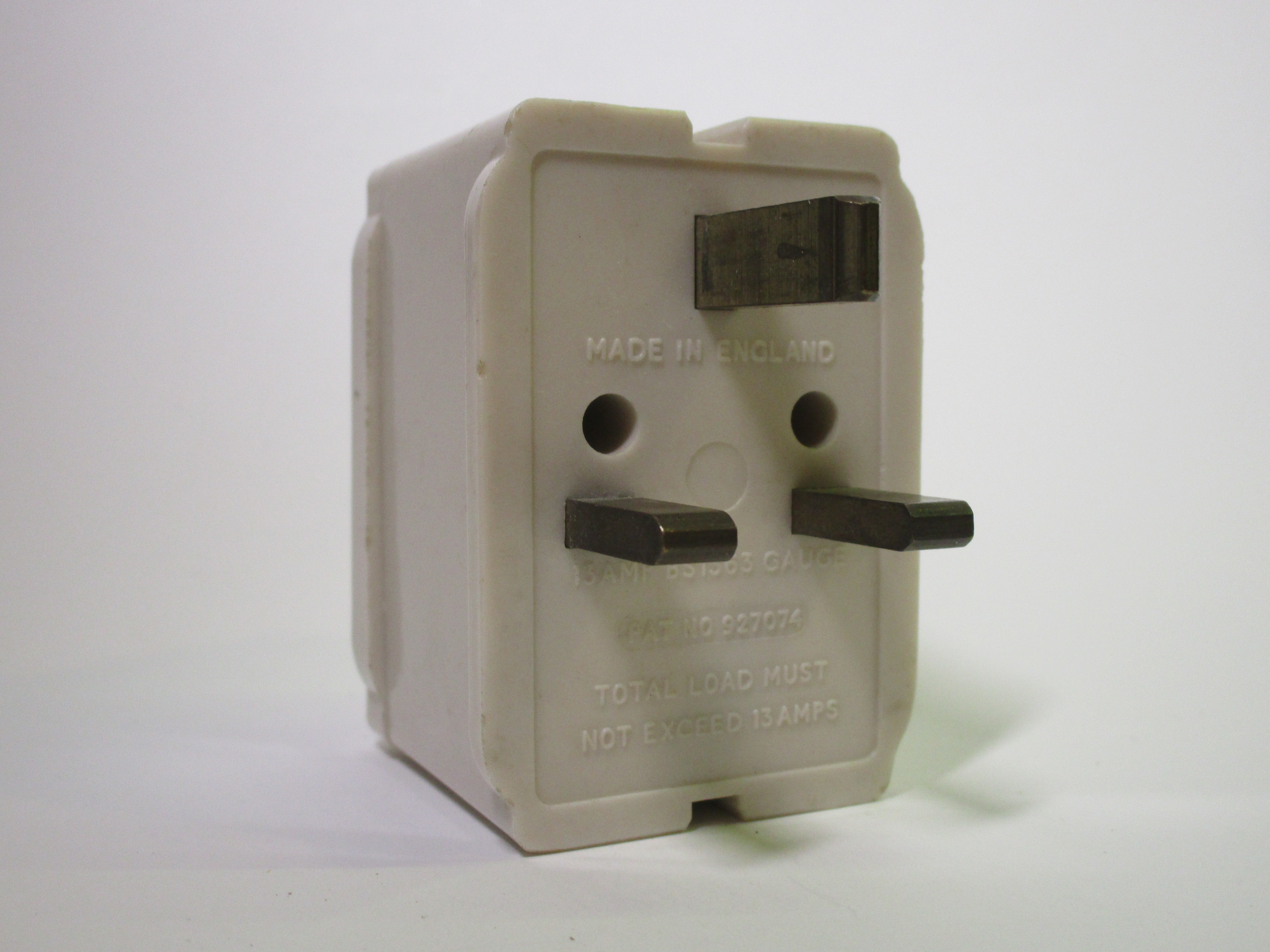 This old multiway adaptor allowed for the connection of up to three plugs to a single socket. Due to its age, it doesn't have plastic sleeving on the L and N pins.