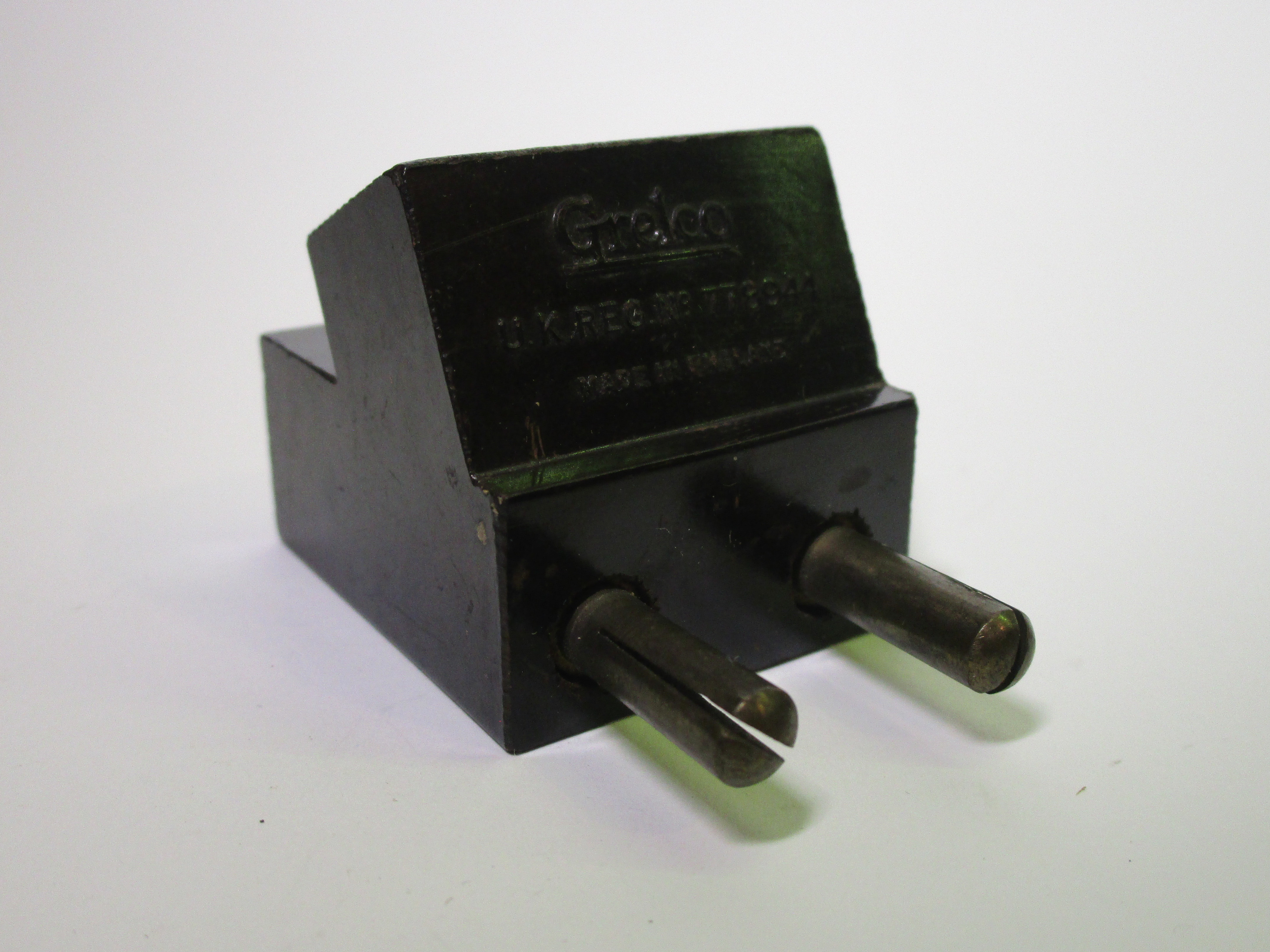 This non-earthed adaptor allowed for the connection of two appliances to a single 5A socket. It also served as a plug converter, as both sockets could accept either a 5A or a 2A two-pin plug. The adaptor was made in England by Grelco and mentions "U.K. Reg. N° 778944".