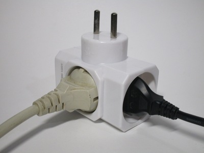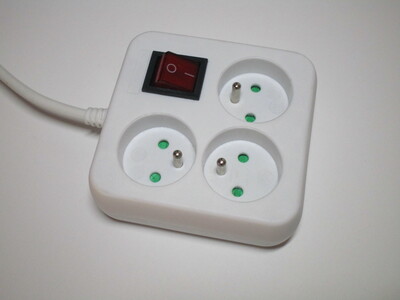 This is a three-way adaptor, which allows up to three items to be connected to a single power socket. Its design is similar to Schuko models, though as CEE 7/5 sockets are polarised it can only be plugged in in a single direction. This adaptor uses a CEE 7/6 plug, which means that it can't be used with Schuko sockets, however this isn't universal: other designs are available which use a CEE 7/7 (Schuko-French hybrid).