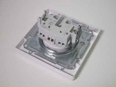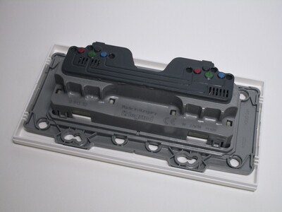 The front cover is made of two parts, one of which would be replaced when mounting multiple electrical accessories together in larger boxes, held on by one screw. It's clear that this device was designed well, from the high-quality materials to details like the inscription of how much insulation to remove from the wires.
